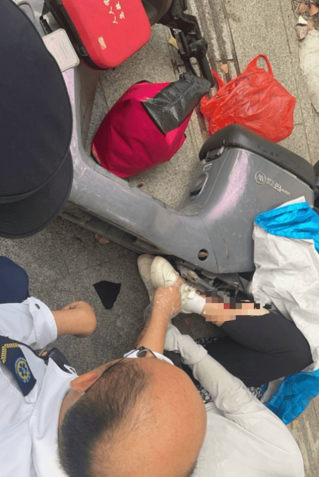 扬州一女子骑车摔倒脚撑戳进小腿,陌生夫妻路过紧急施救