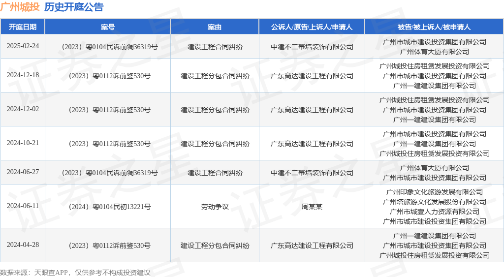 本站消息,根据天眼查APP显示,近日公布了一则广州市城市建设投资集团有限公司作为被告/被上诉人的开庭公告,详细内容如下: